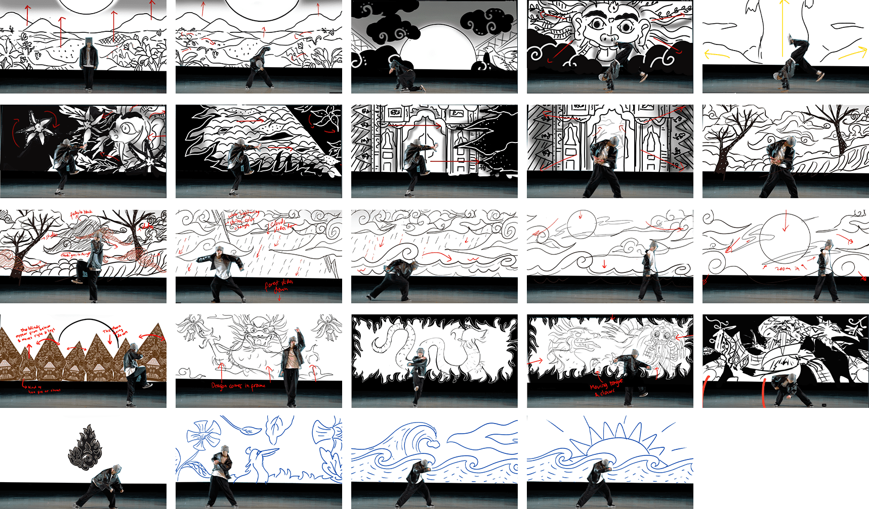 Our concept revolves around an epic "villain arrival" theme. The story begins in a vibrant and fertile land that suddenly falls under attack by monstrous, otherworldly creatures, spreading chaos and darkness. As the atmosphere grows grim, a sacred dragon emerges as the hero, defeating the menace and restoring peace. This transformation shifts the tone from dark and ominous to bright and colorful once again.In this project,