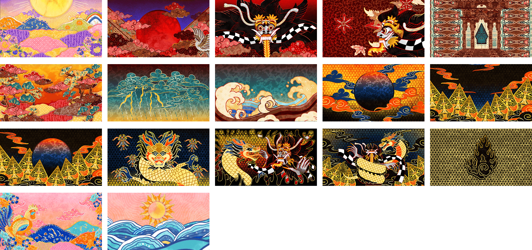 The first stage displays the land's natural beauty, with vivid and colourful colours that reflect its lively, flourishing nature. In stage two, the villain's arrival brings a dramatic shift as the colors transition to darker, more chaotic tones, highlighting the atmosphere of approaching destruction. Stage three introduces the hero hrough a majestic and powerful palette who is represented by a sacred dragon, with bold accents that evoke the intensity of battle. Finally, in the fourth stage, the land is reborn, with bright, rejuvenating colors symbolizing renewal and hope.