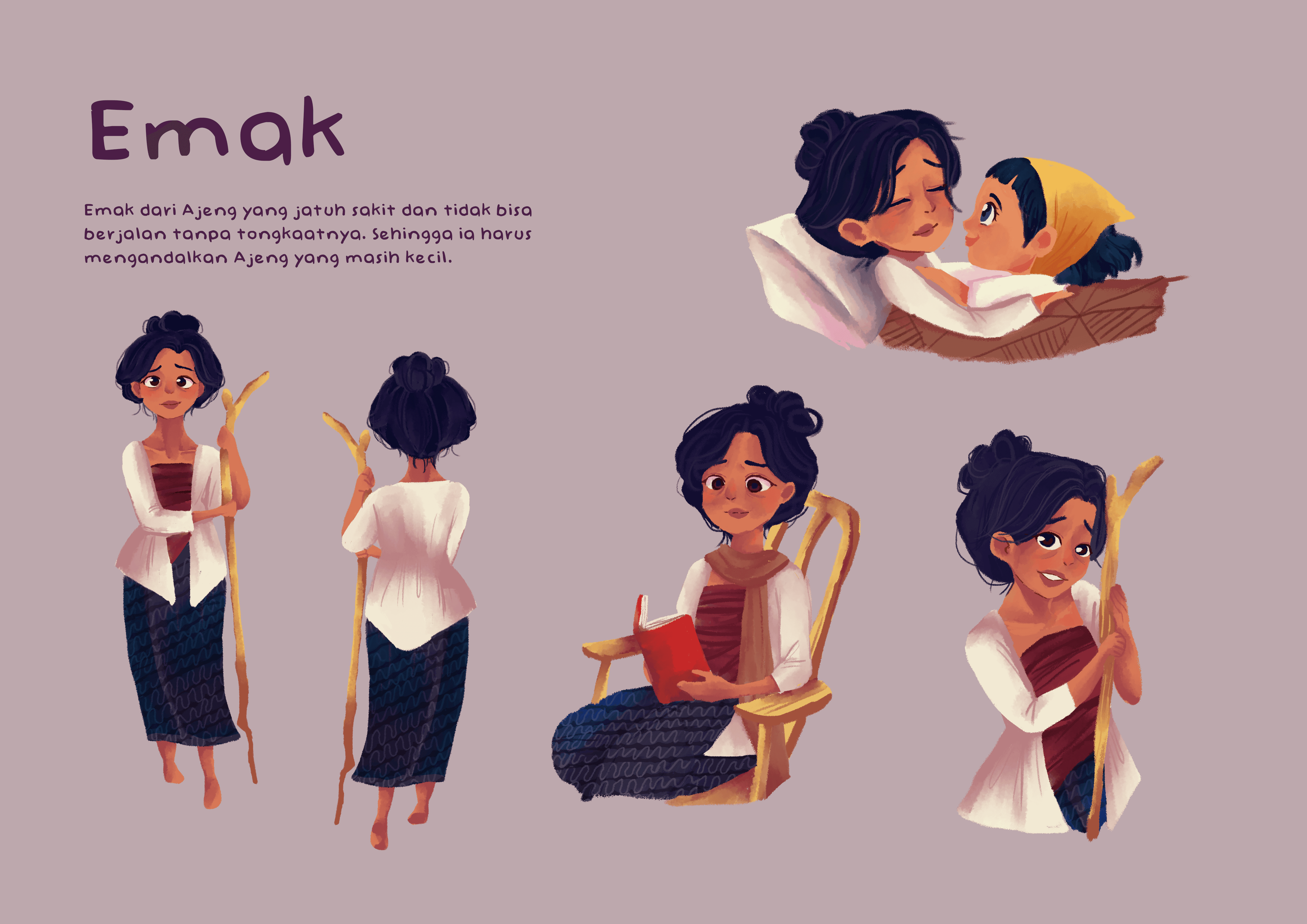 Ajeng’s mother is a gentle and loving figure who has fallen ill, leaving her unable to walk without the help of her cane. Despite her illness, she remains strong for Ajeng, though she often feels guilty for relying on her young daughter. Her deep love and quiet strength inspire Ajeng to find the magical batik tambal that might heal her.