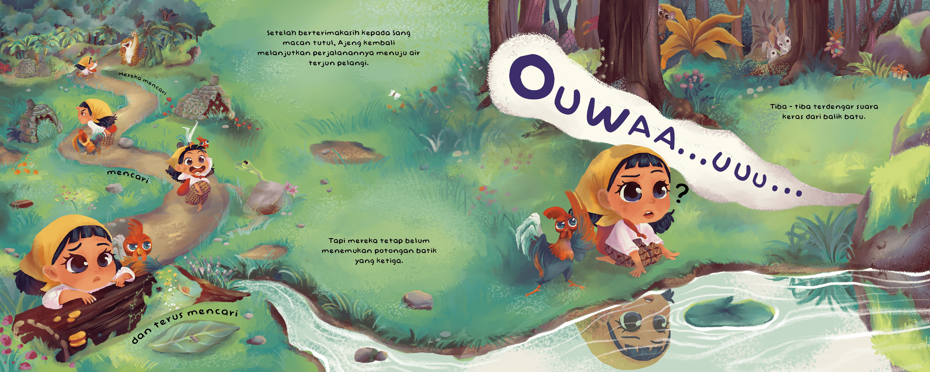 Following the map's winding path, Ajeng and Petok venture through golden rice fields and shadowy forests, where they stumble upon animals in distress. Always ready to lend a hand, Ajeng helps the creatures, who, in return, gift her scraps of enchanted fabric. Grateful and determined, Ajeng collects these magical pieces, hopeful that they will create the magical blanket that could restore her mother’s health.