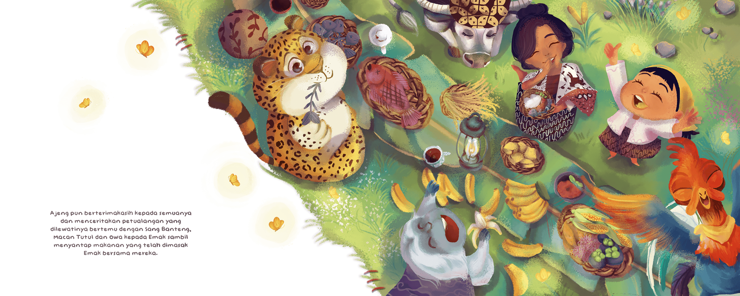 Overjoyed, Ajeng and Petok thank the animals, celebrating their triumph with a joyful feast that brings everyone together in a spirit of gratitude and friendship.This fun and whimsical adventure reminds us that kindness and persistence, even in the face of unexpected challenges, can weave together the magic that heals hearts and spirits.