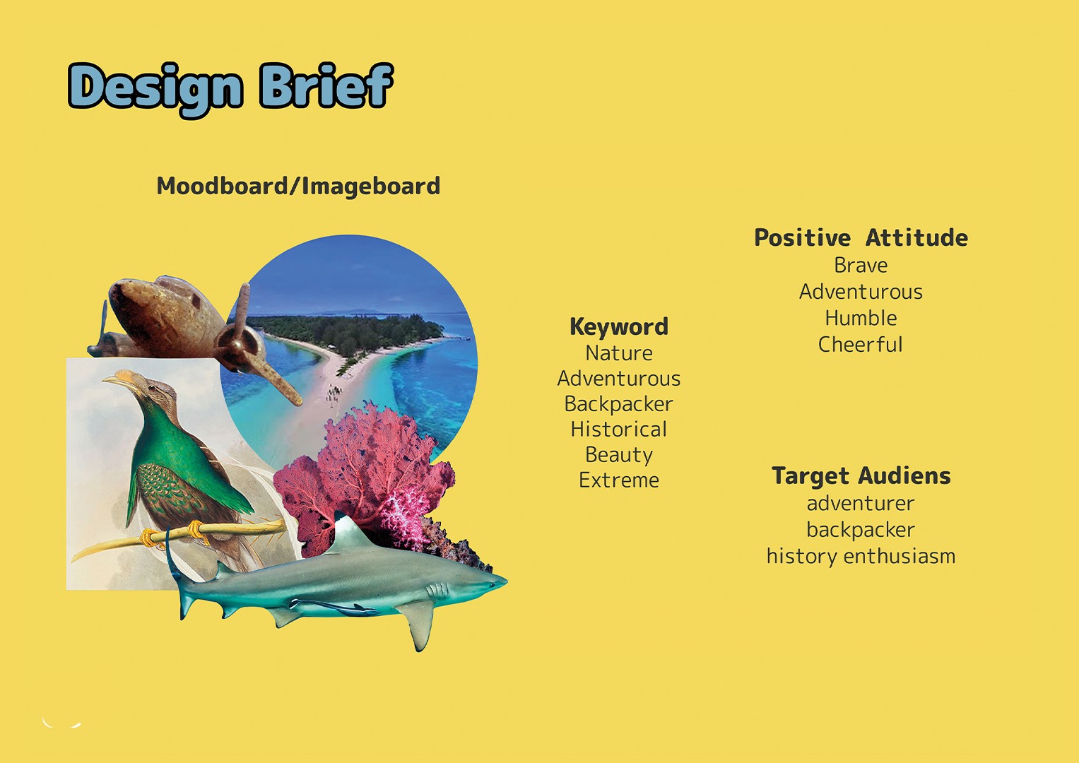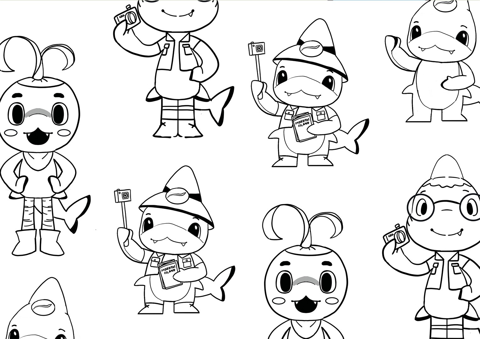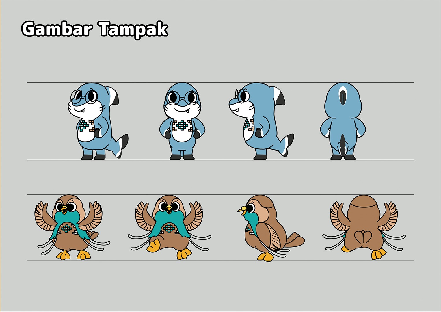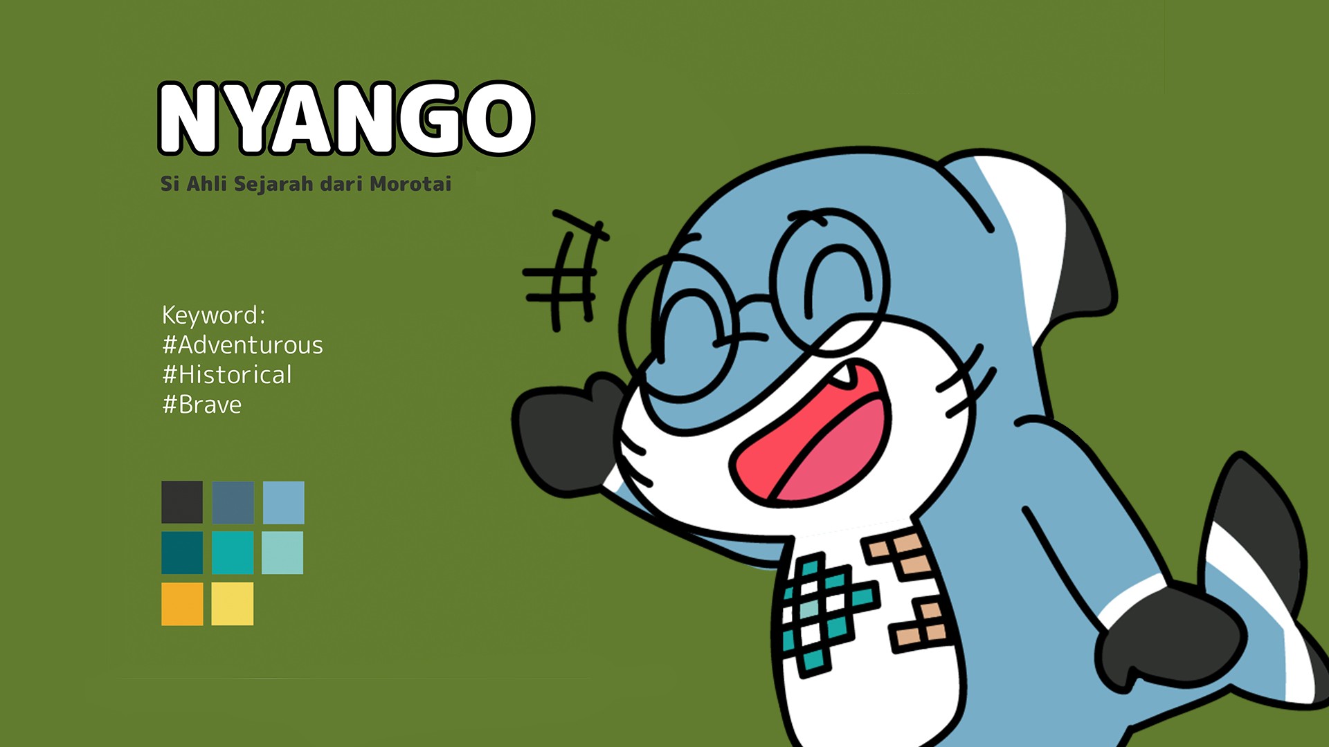 Nyango is a curious and adventurous gurango, a species of shark native in the Morotai, whose body is wrapped in traditional Morotai weaving patterns. Nyango's passion for history begins from his childhood. He dreams to work as a historian exploring and sharing the treasures and beauty of Morotai Island, a place he loves dearly. His mission is to inform both residents and visitors about the island's history while showcasing the remarkable and unique history of Morotai to the globe. He sets off on his adventures alongside Binya, his cheerful siblings.