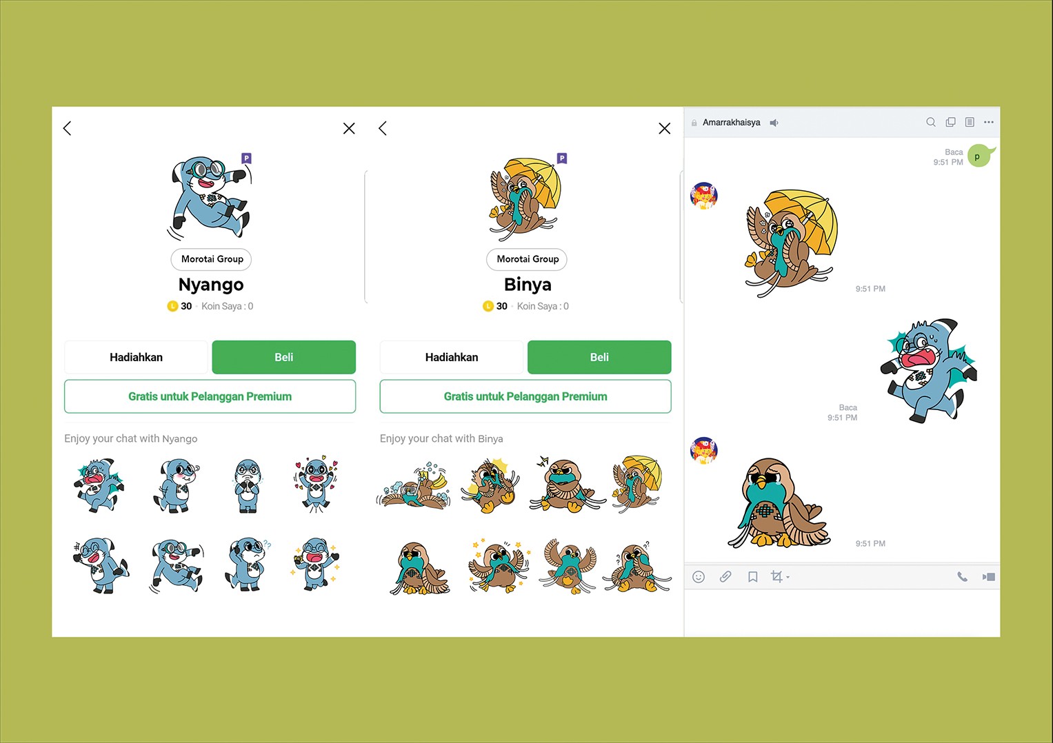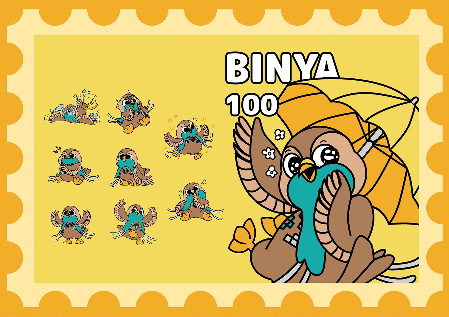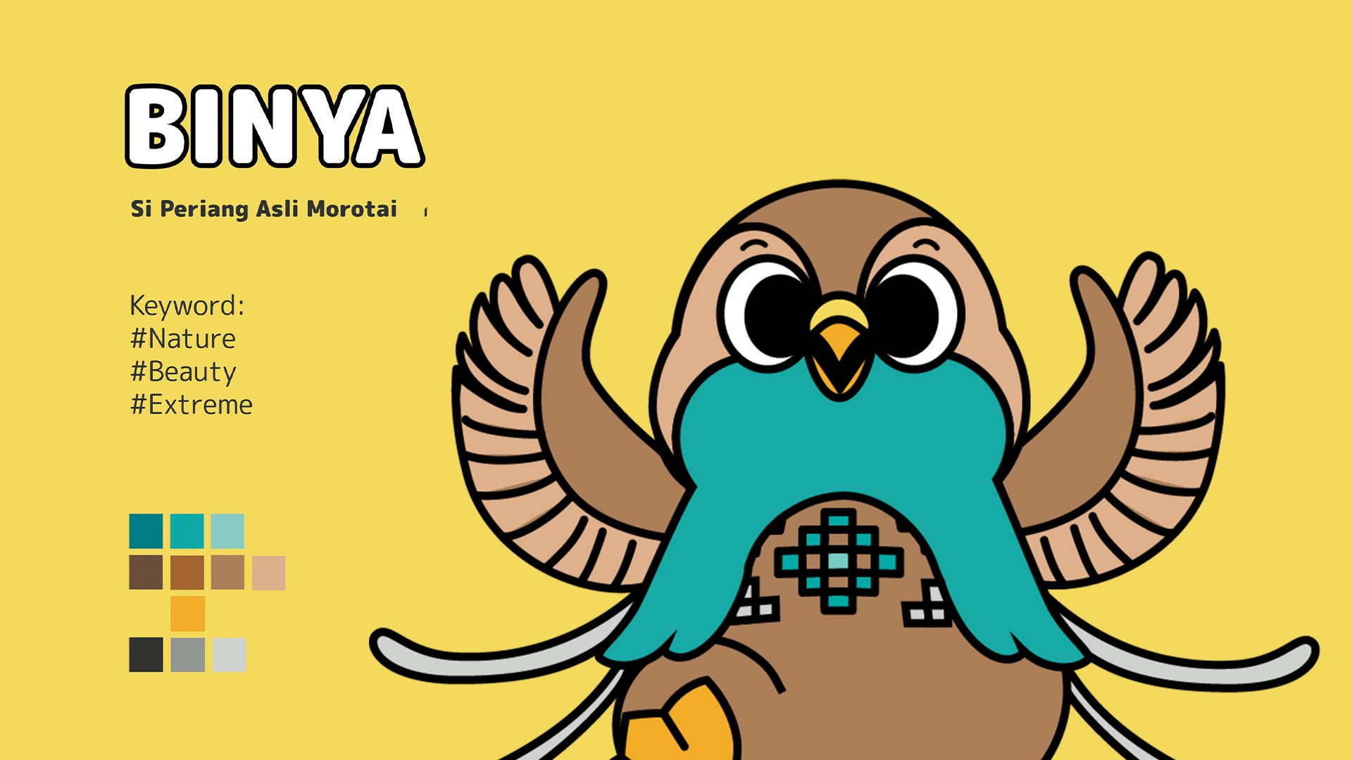 Binya is a cheerful Bidadari bird with traditional Morotai weaving patterns wrapped around its body. The Birango family discovered Binya on Small Dodola Island, and they eventually adopted her as a sibling. Binya has always been a joyful person who makes everyone around her happy, even when she was a small child. Her plan is to highlight Morotai Island's grace and beauty in order to establish it as one of Sulawesi's premier natural tourism locations. Binya thinks that by bringing joy to everyone in the community, Morotai will grow into a peaceful and beautiful island.
