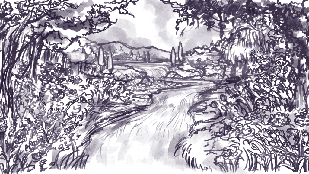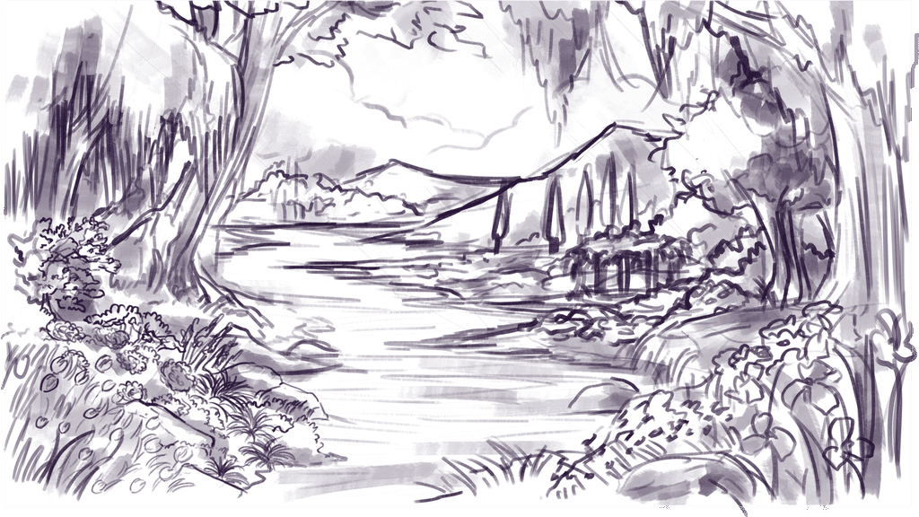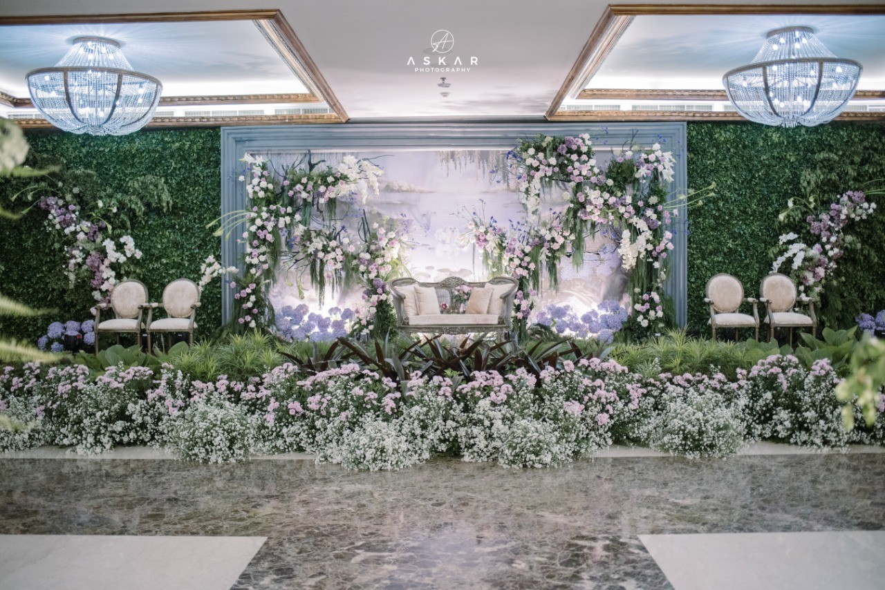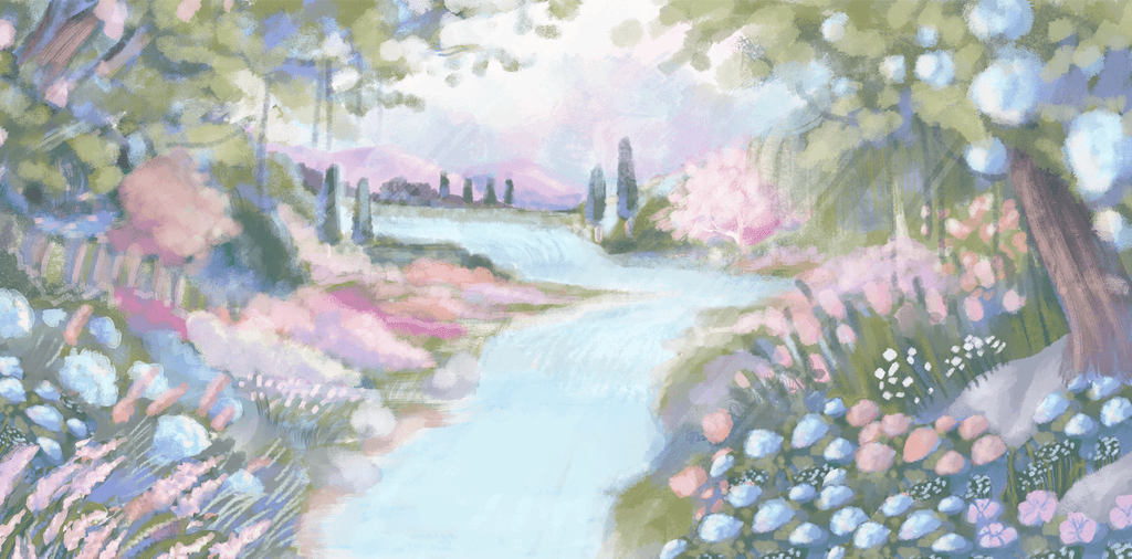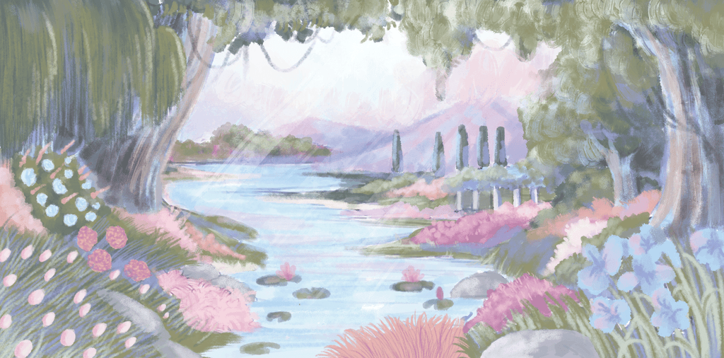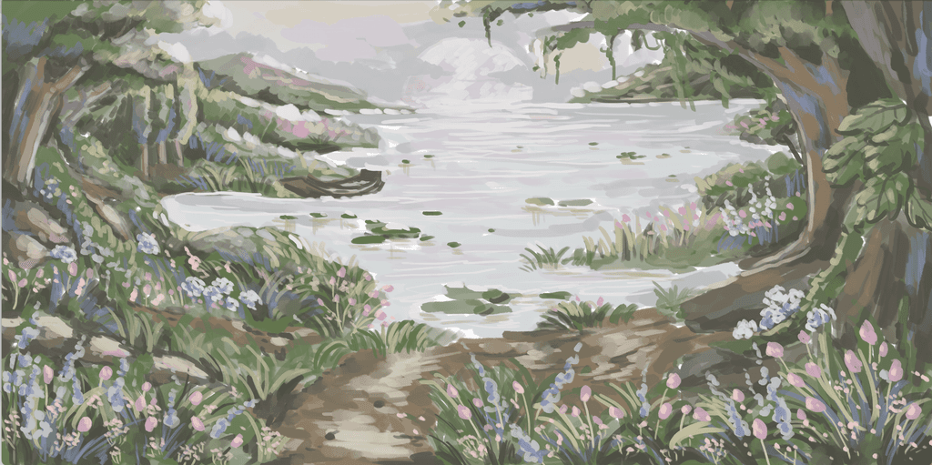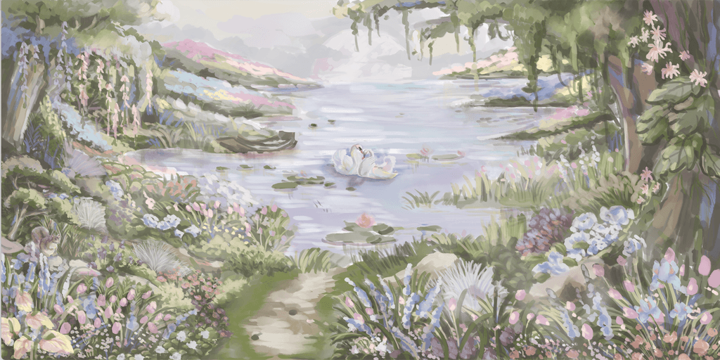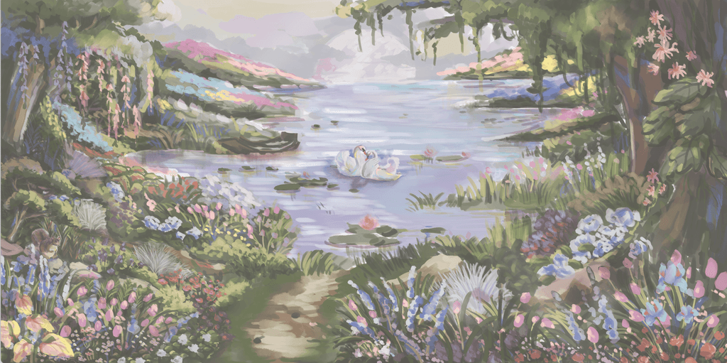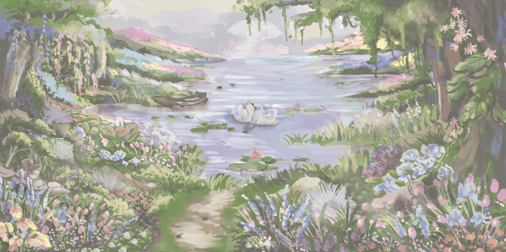 A glimpse of process into one of our another wedding backdrop illustration project collaboration with Suryo Decoration that capture the beauty of an enchanted lake at sunset. The scene features a serene lake surrounded by blooming flowers, bathed in the soft purples of dusk. Two elegant swans glide across the water, while a curious little squirrel adds a touch of charm. This romantic and magical setting became the perfect backdrop for the couple's unforgettable day.