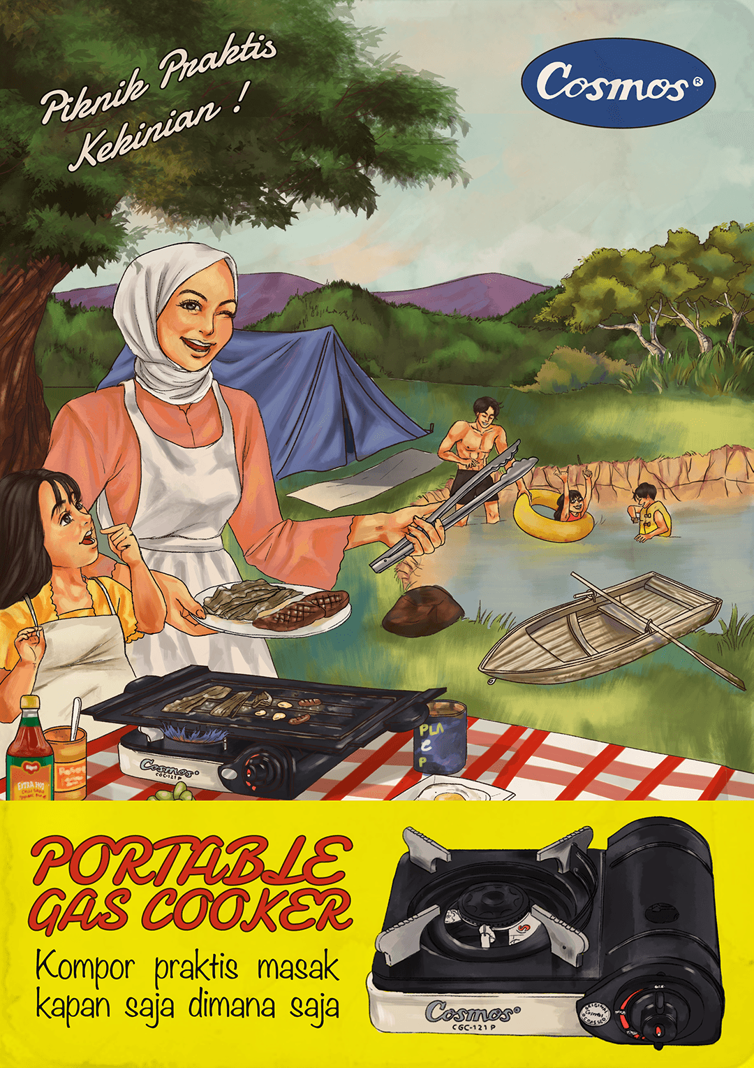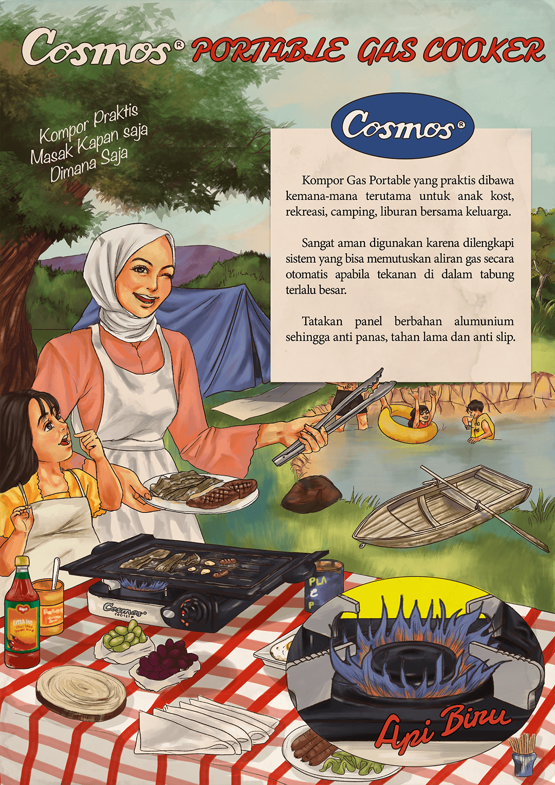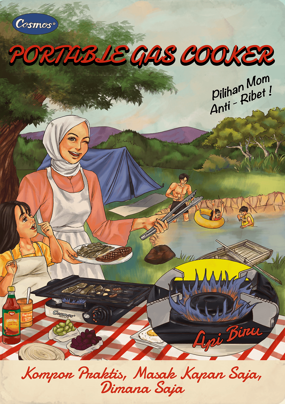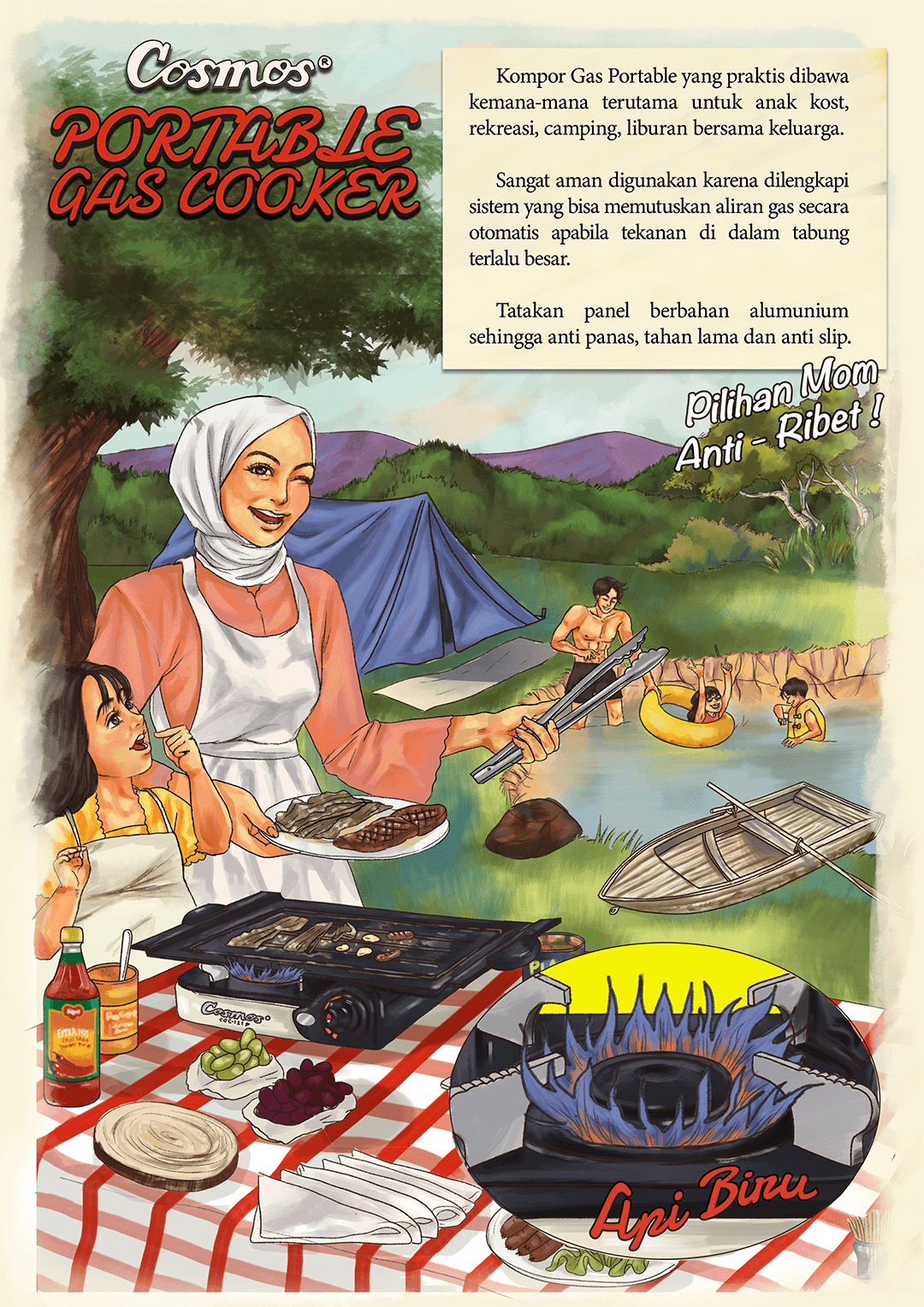 This illustration features a charming, vintage-style advertisement for a portable stove, set in the context of a family picnic or camping trip. This poster highlights how the portable stove adds comfort and fun to any outdoor adventure, making it an essential companion for families who love picnics, camping, and spending time together. The portable stove is the focal point, showing its ease of use and convenience illustrate the brand tagline "Praktis dibawa kemana-mana" and the detail of the advantages of the stove . The colors are warm and earthy, with a soft vintage filter that evokes a sense of nostalgia and simplicity, recreating the look of vintage poster.