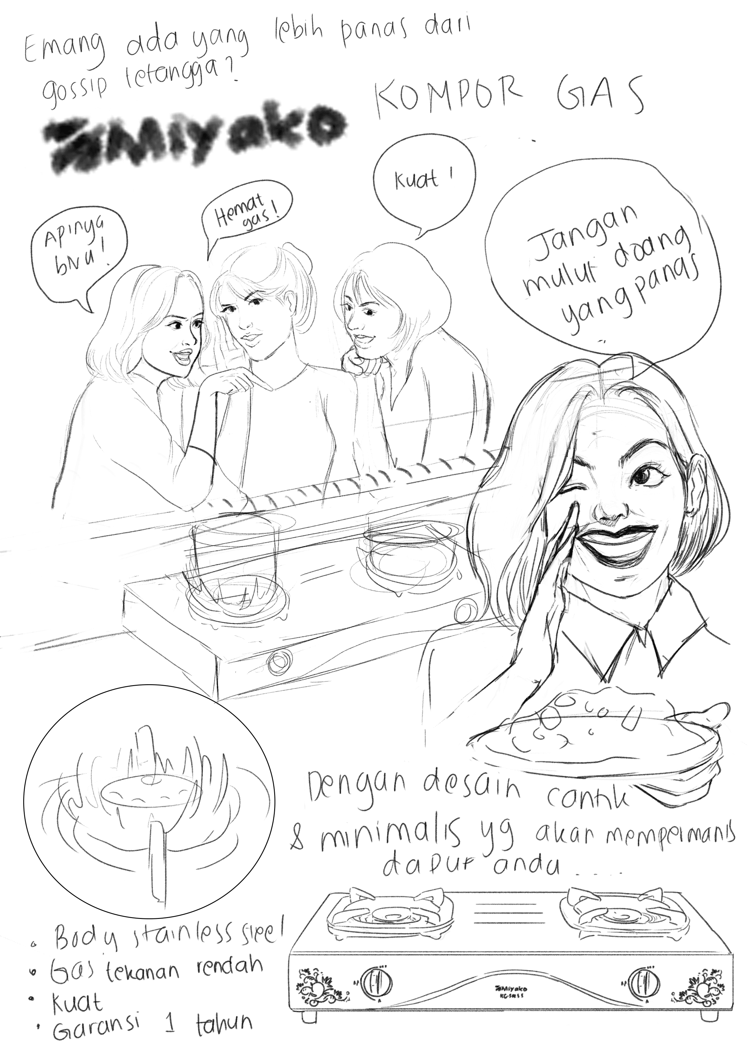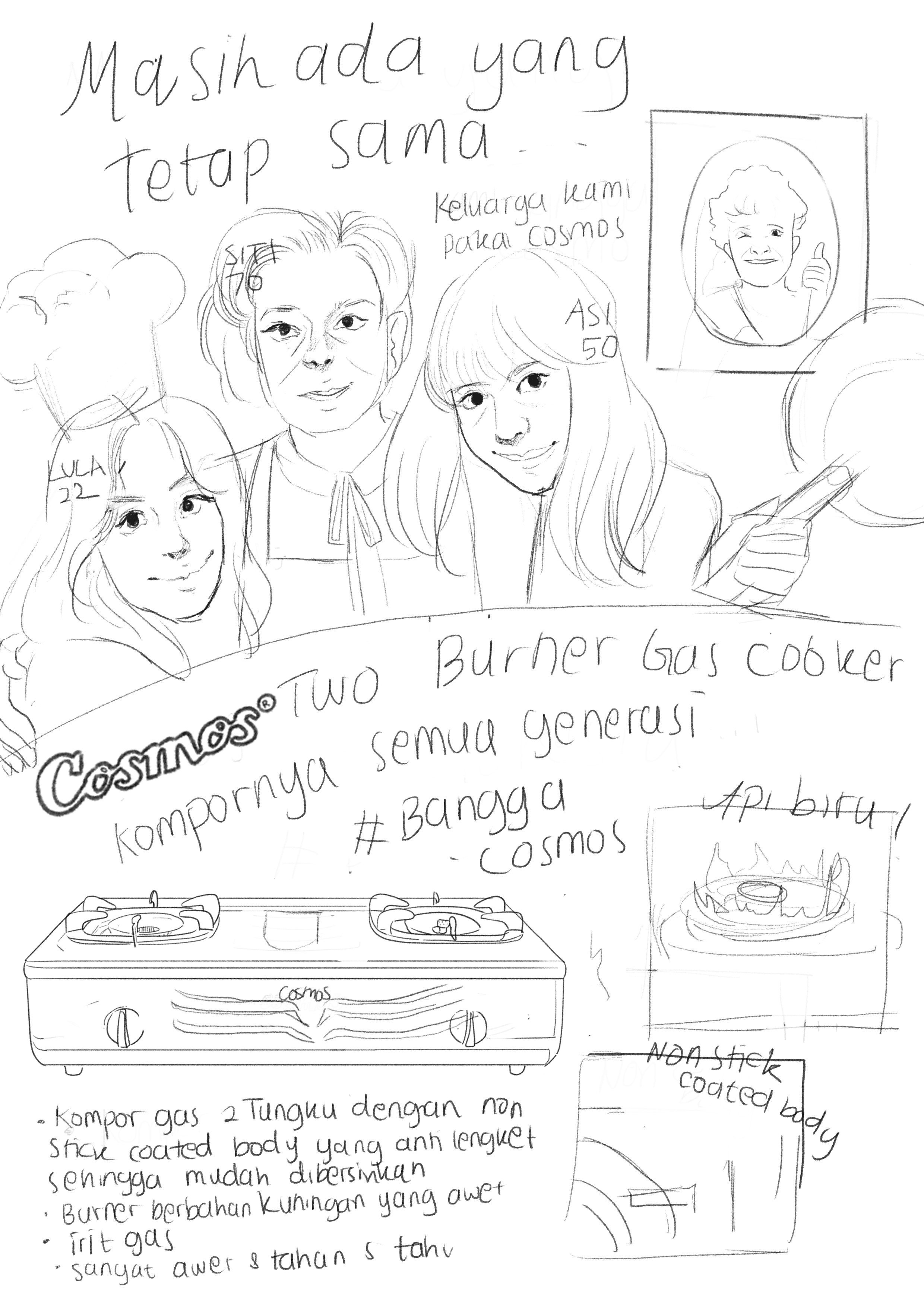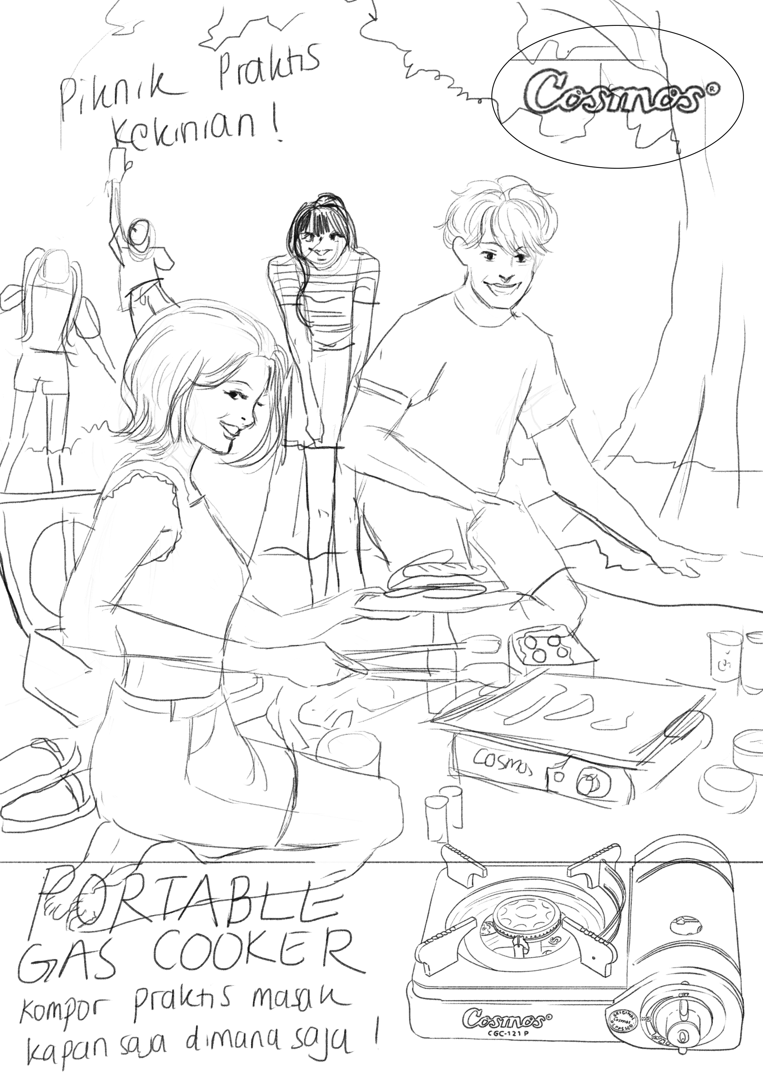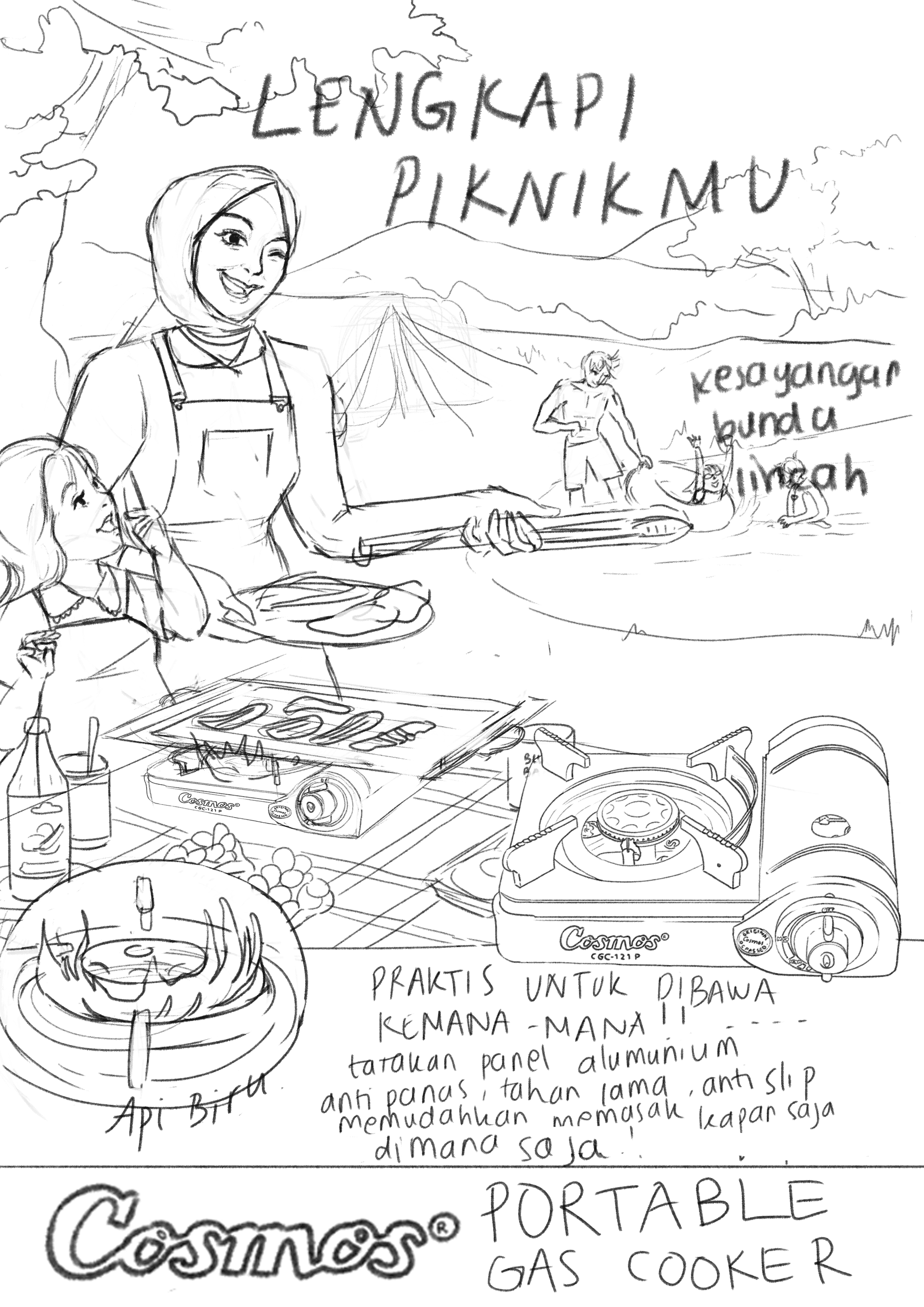 This illustration features a charming, vintage-style advertisement for a portable stove, set in the context of a family picnic or camping trip. This poster highlights how the portable stove adds comfort and fun to any outdoor adventure, making it an essential companion for families who love picnics, camping, and spending time together. The portable stove is the focal point, showing its ease of use and convenience illustrate the brand tagline "Praktis dibawa kemana-mana" and the detail of the advantages of the stove . The colors are warm and earthy, with a soft vintage filter that evokes a sense of nostalgia and simplicity, recreating the look of vintage poster.